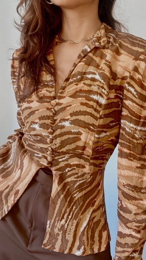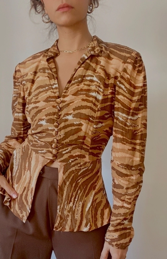 Camisa vintage estampada de grepe com cintura marcada, mangas com pequenas pregas no ombro, e botões forrados no fechamento frontal.