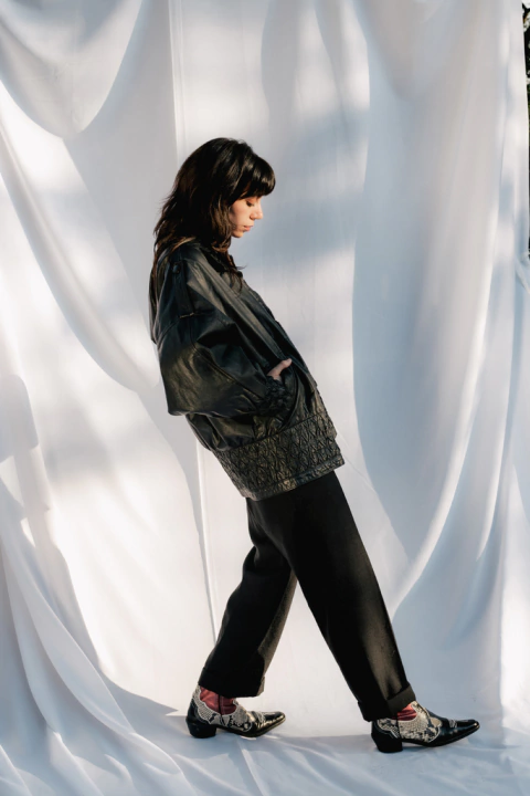 Jaqueta de couro oversized com ombros bem deslocados, recortes, matingale com botão no ombro e detalhe do tipo caseado de abelha na barra e manga.